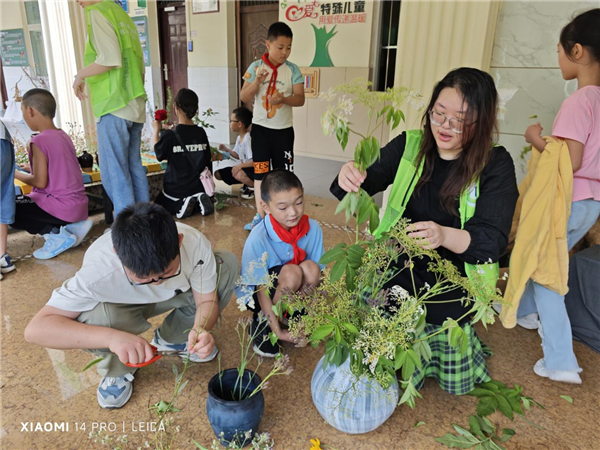 7月3日的活动安排是绿色创意培训,“绿创”小分队给白鹿小学的孩子们讲解了最新的绿色科技发展和应用案例,并开展了绿色创意大赛,她们将孩子们分成6个小组,各自发挥想象和创意制作盆景。
