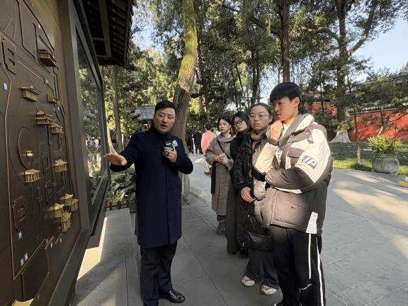 活动伊始,志愿者们跟随专家李志老师开启文化探寻之旅。从“三顾茅庐”的千古佳话到“出师未捷身先死”的壮志悲歌,从红墙夹道的精巧布局到古柏森森的清幽意境。李老师结合史料与传说,让三国英雄的形象愈发鲜活。行至红墙夹道,朱红墙壁与翠绿古柏相映成趣,李老师引导志愿者们观察光影变化下的园林美学,感受“曲径通幽处”的古典意境;在古柏区,面对树龄超千年的“汉柏”,李老师讲解古树名木的保护知识,强调文物古迹与自然生态共生的重要性。志愿者们手持笔记本认真记录,不时举手提问,千年文脉在细致讲解与深度互动中,悄然融入每个人的心中,也让大家更加清晰地认识到,作为志愿者,不仅要提供贴心服务,更要成为文化根脉的守护者、历史温度的传递者。大家在聆听与感悟中,深刻领会到武侯祠作为“忠义”与“智慧”精神传承地的深厚内涵,也坚定了守护文化根脉的责任担当。