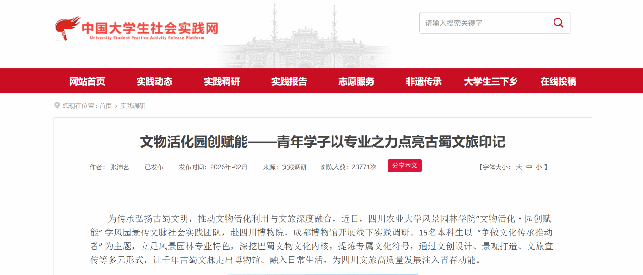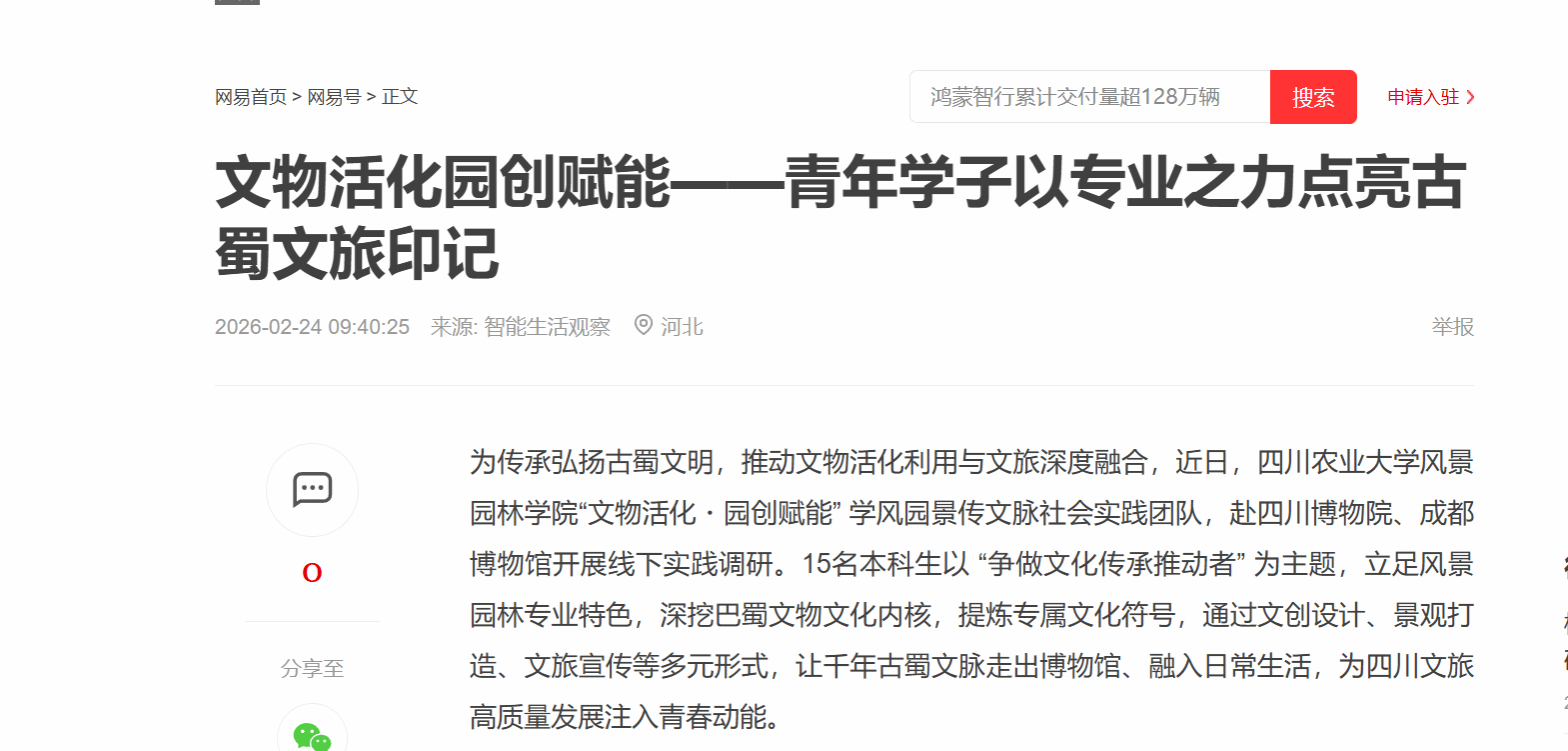 为传承弘扬古蜀文明,推动文物活化利用与文旅深度融合,近日,K1体育“文物活化・园创赋能” 学风园景传文脉社会实践团队,赴四川博物院、成都博物馆开展线下实践调研。15名本科生以 “争做文化传承推动者” 为主题,立足风景园林专业特色,深挖巴蜀文物文化内核,提炼专属文化符号,通过文创设计、景观打造、文旅宣传等多元形式,让千年古蜀文脉走出博物馆、融入日常生活,为四川文旅高质量发展注入青春动能。