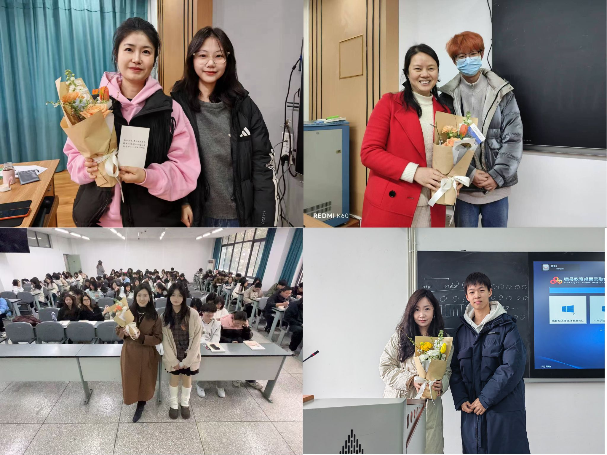 在开展的“鲜花赠园丁”妇女节感恩活动中,员工们手捧鲜花走进课堂,向正在授课的女教师致以节日祝福。“老师辛苦了!”课堂上,员工代表为每位女教师送上康乃馨和手写贺卡,感谢她们在育人路上的辛勤付出。